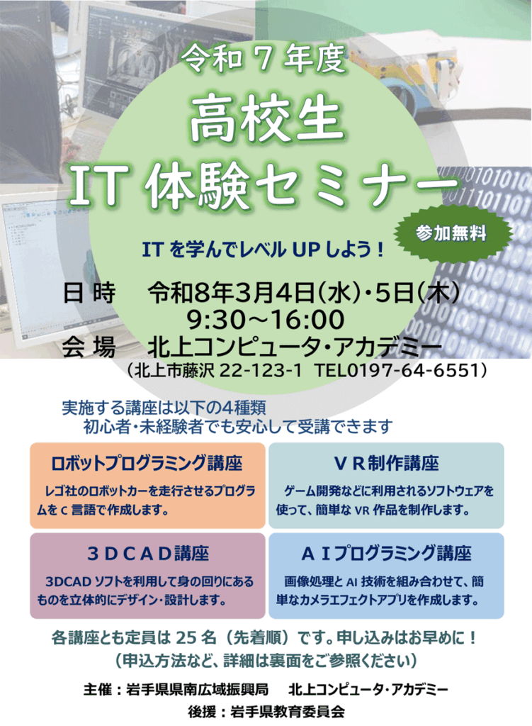 岩手県県南広域振興局と本校の主催で、高校生を対象とする「IT体験セミナー」を開催します。