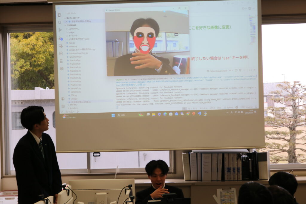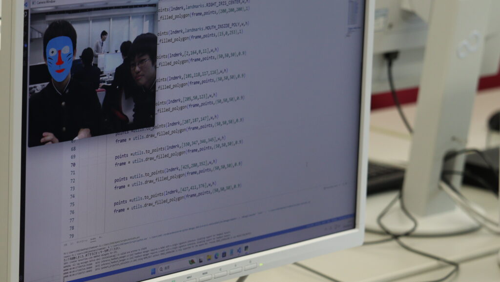 AIプログラミング講座(新設)では、画像処理とAI技術を組み合わせ、簡単なカメラエフェクトアプリの制作に挑戦しました。AIが人の顔や手を認識し処理するしくみなどについて学びながら、実際に動くアプリを作り上げる体験は、参加者にとって新鮮で刺激的だったようです。