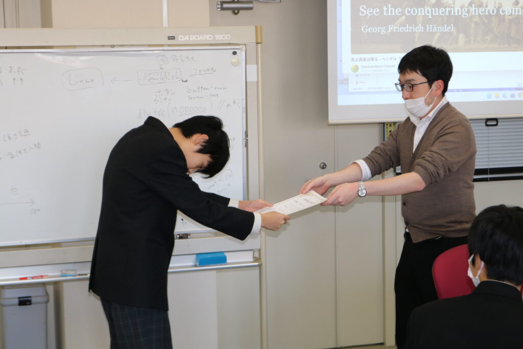 講座終了後には担当講師から一人ずつそれぞれ修了証が手渡され、参加した生徒からは