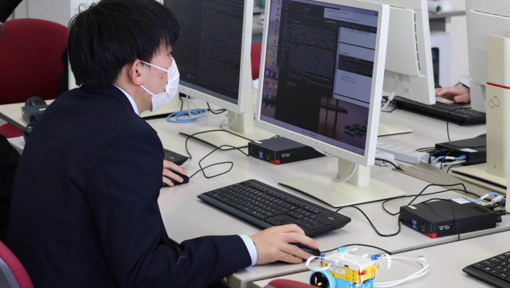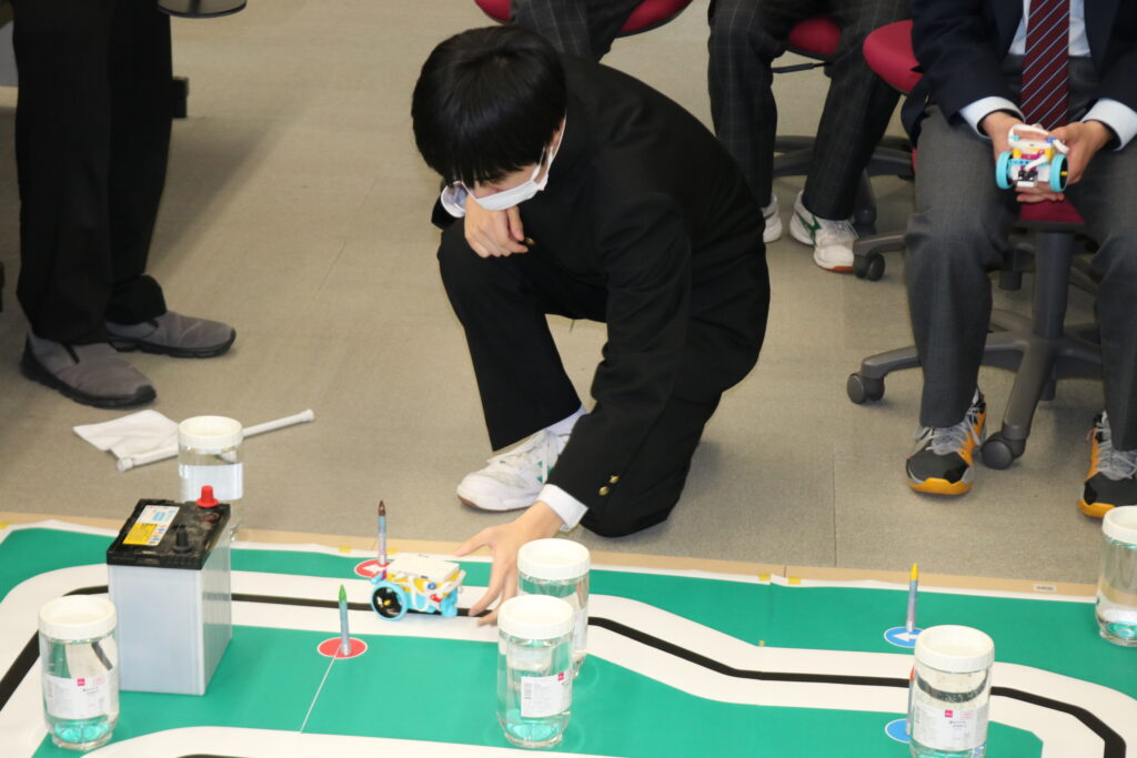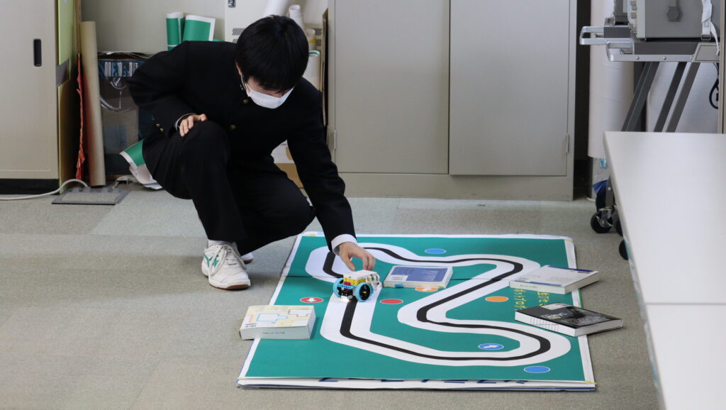 ロボットプログラミング講座では、C言語を使ってロボットカーをラインに沿って走行させるプログラムを作成しました。思い通りに動かすために何度もテストを繰り返し、2日目の最後には走行会を行いました。見事完走させることができた生徒、ロボットが思いもよらない方向に進んでしまい、コースアウトとなった生徒などさまざまでしたが、互いの成果をたたえあう姿が印象的でした。