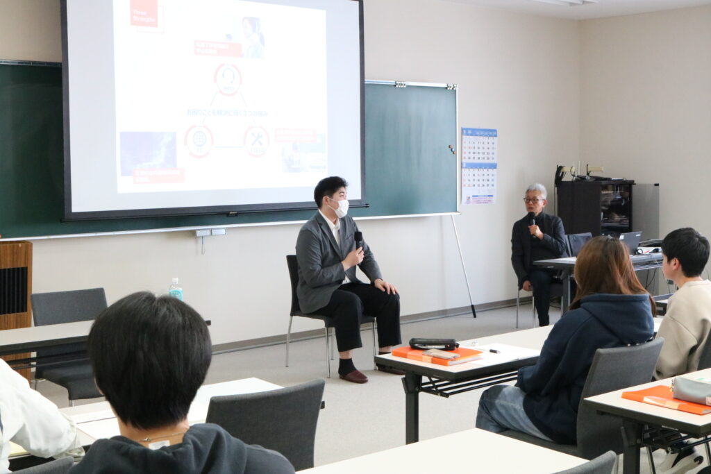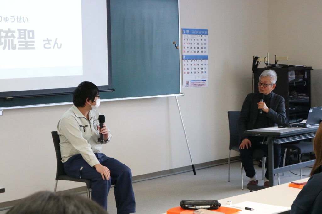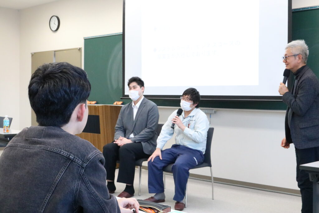 今回ご参加いただいた卒業生は、鈴木琉聖さん(令和3年度卒、(株)アイオー精密)と巴優汰さん(令和5年度卒、(株)プレステージ・インターナショナル)のお二人です。学生たちは、お二人の実体験に基づくお話に熱心に耳を傾けていました。