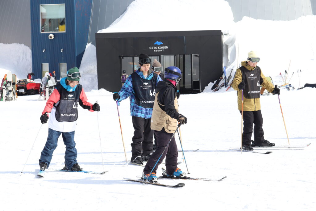 研修の前半はインストラクターの方々に教えてもらいながら、滑り方の基礎を練習しました。初めてスキー・スノーボードをするという学生が大半で、雪上で姿勢を保てず転んだり、思った方向に進まなかったりと苦戦している様子でした。